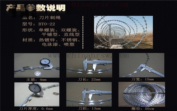刀片刺繩按照安裝方法不同可分為:(蛇腹式) 螺旋式刀片刺繩,直線型刀片刺繩,平板式刀片刺繩,刀片刺繩焊接網等。片刺繩按照安裝方法不同可分為:(蛇腹式) 螺旋式刀片刺繩,直線型刀片刺繩,平板式刀片刺繩,刀片刺繩焊接網等。